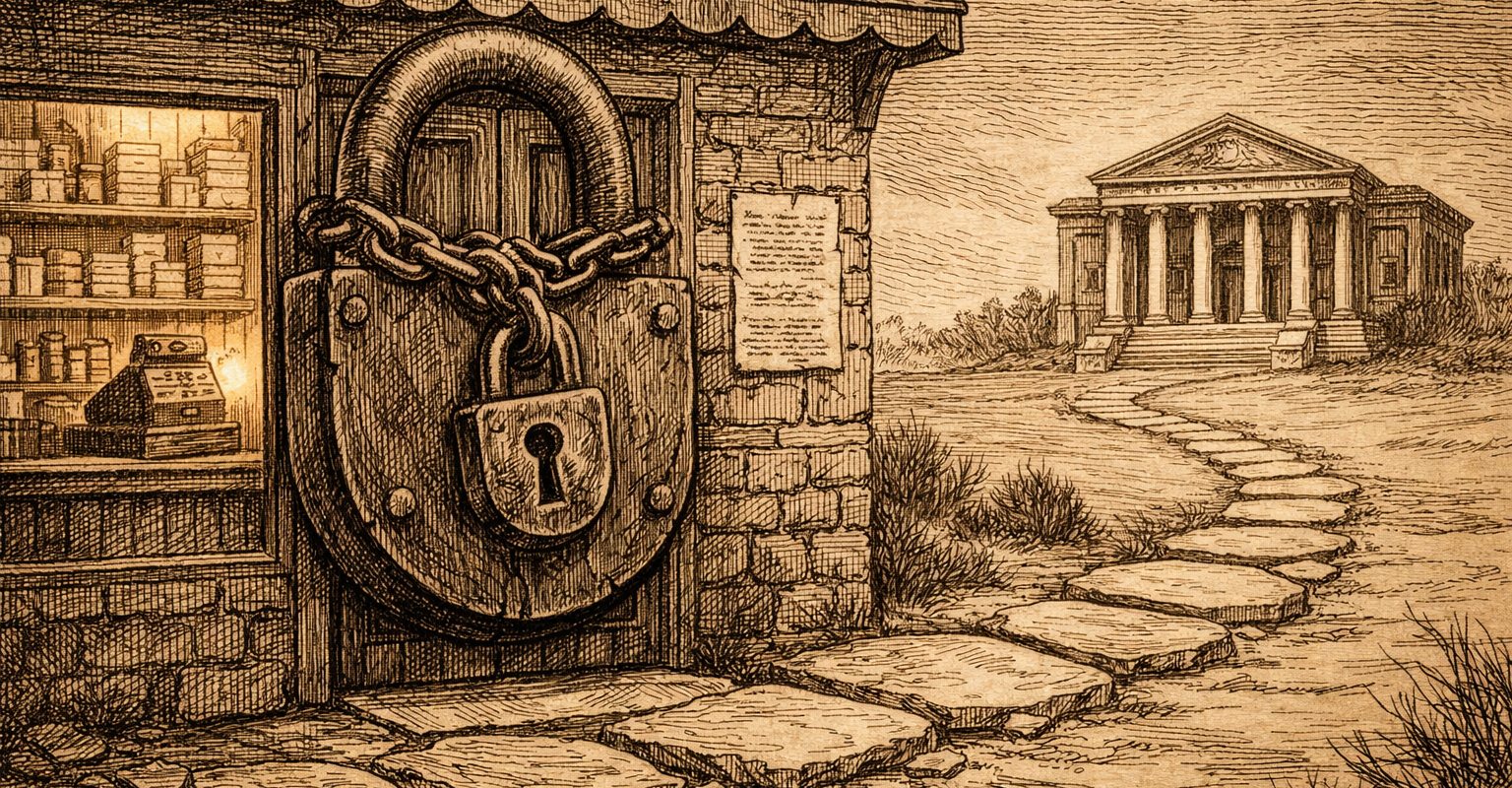 O mais curioso — e aqui a fábula ganha seu tempero de absurdo, sem o qual nenhuma fábula brasileira se completa — é que o Cobrador, ao trancar a loja, colou na porta um aviso formal. E o aviso não dizia “trancado por dívida” nem “fechado por declaração atrasada”. Dizia “fraude”. Dizia “operações fictícias”. Palavras graves, pesadas, daquelas que fazem o vizinho atravessar a rua quando vê o acusado passar.